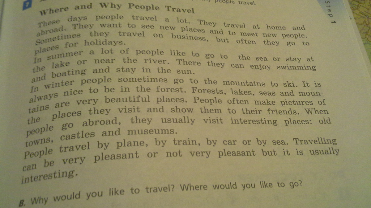 В наши дни часто путешествуют.Путешествуют дома(в своей стране) или за границей.Они хотят видеть новые места и встречать новых людей.Иногда путешествуют по бизнесу,но чаще на выходных.Летом много людей едут на море,озёра или на речку.Здесь они могут наслаждаться плаванием,рыбалкой и загорать на солнце.Зимой люди иногда идут в горы,для катания на лыжах.Всегда хорошо находиться в лесу.Леса,моря и горы очень красивые места.Люди часто фотографируются в тех местах,где бывают,и показывают фотографии своим друзьям.Когда люди уезжают за границу,они часто посещают интересные места,старые здания и музеи.Люди путешествуют на самолёте,поезде,машине или по воде.Путешествия могут быть очень приятными,или не приятными,но часто интересными