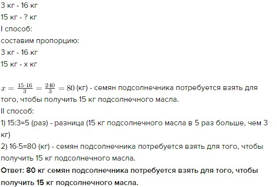 чтобы получить 3 кг подсолнечного масла надо взять 16 кг семян подсолнечника. сколько килограммов семян потребуется чтобы получить 15 кг подсолнечного масла?