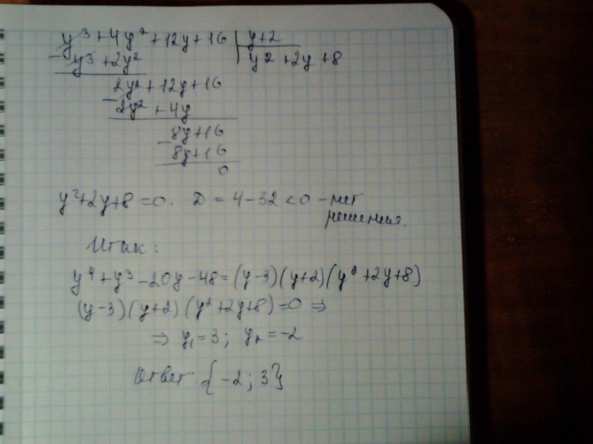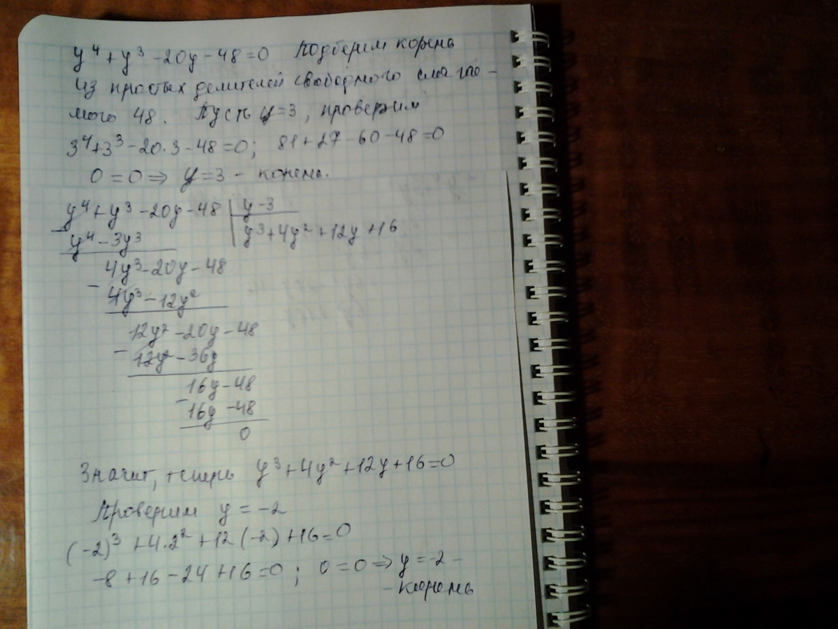 Использован метод подбора корней из простых делителей свободного слагаемого, деление многочленов столбиком