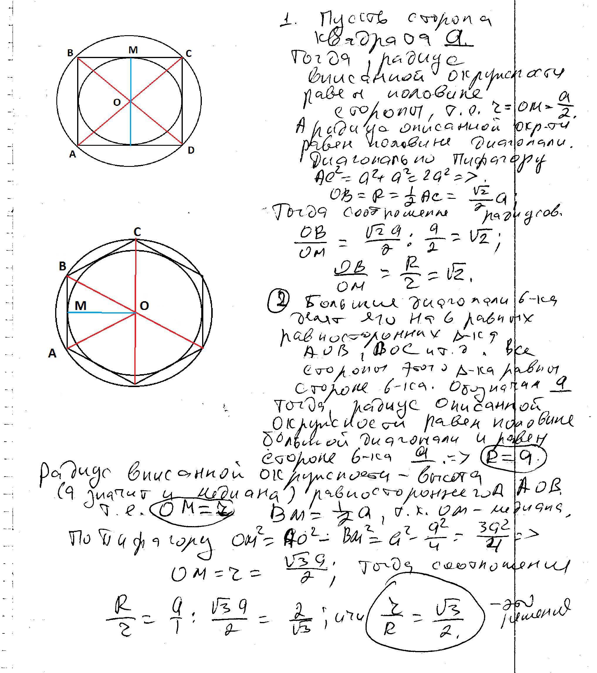 Отношение радиуса описанной к радиусу вписанной в квадрат окружности равно: