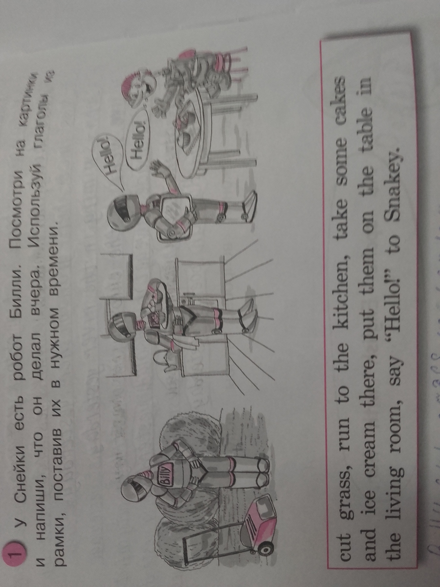 У Снейки есть робот Билли. Посмотри на картинки и напиши,что он делал вчера.Используй глаголы из рамки,поставив их в нужном времени.