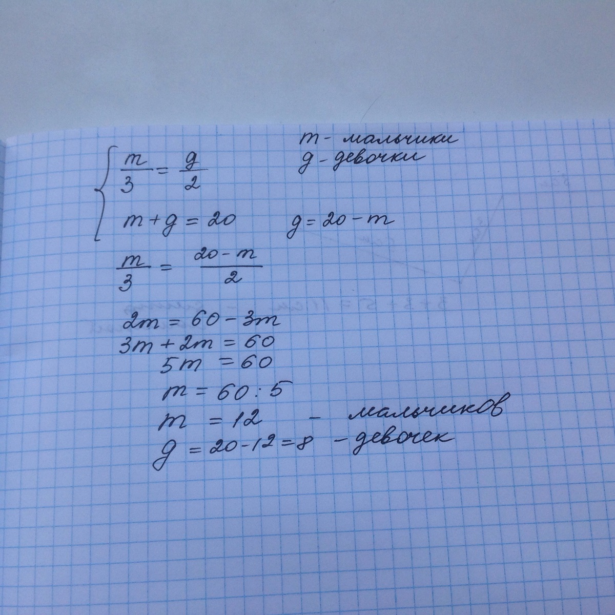 В классе 20 учеников. они сели за парты по двое так, что ровно треть мальчиков сидят с девочками, и ровно половина девочек сидят с мальчиками. сколько мальчиков в классе???
