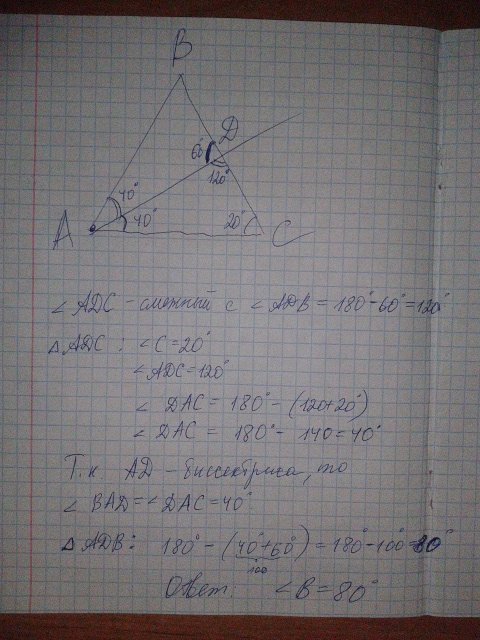 В треугольнике ABC угол C равен 20 градусов, AD-биссектриса угла A, угол ADB равен 60 градусов. Найдите градусную меру угла B.