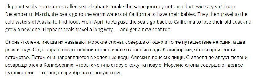 Слоны-тюлени, иногда их называют морские слоны, совершают одно и то же путешествие не один, а два раза в году. С декабря по март тюлени отправляются в тёплые воды Калифорнии, чтобы воспроизвести потомство. Потом они направляются в холодные воды Аляски в поисках пищи. С апреля по август тюлени возвращаются в Калифорнию, чтобы сменить старую шкуру на новую. Морские слоны совершают длительное путешествие и заодно приобретают новую шкуру.
