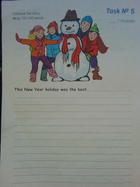 This new year holidays was the best.Me and my friend really had fun this winter.We was playing snowballs and also we was skiing.It was not so cold but every time i was going for a walk my mother was telling me to wear a hat.When it was snowing i was sitting at home,read my favorite book and drink tea.I love winter becouse in is the coziest season of the year.One of my favorite moments of this holidays is our snowman.We were trying to do it beautiful and unusial.When snowman was done we were so happy.I will never forget this holidays