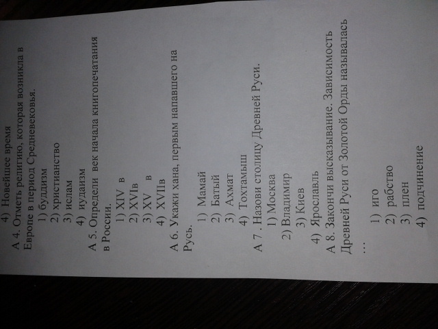А 4.-4)иудаизм ,А 5.-4)17 век ,А 6.-2)Батый ,А 7.-3)Киев ,А 8.-1)иго.