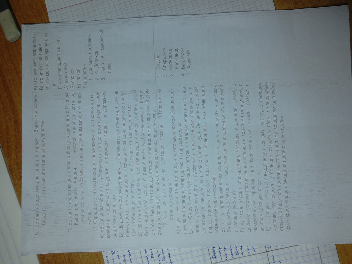 1)321; 2б; 3г; 4г;5 б;6а; 7г;8г;9б;10в;11 Долохов ,дядюшка,Пьер в масонской ложе,12)Кутузов,Багратион,Государь,Аракчеев,Сперанский