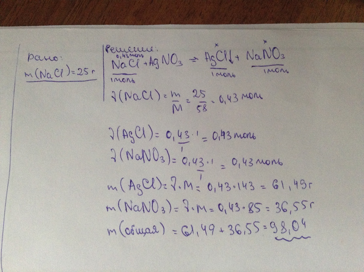 Определите массу соли, полученной при взаимодействии 25 граммов хлорида натрия и нитрата серебра, учитывать соль, выпавшую в осадок.
