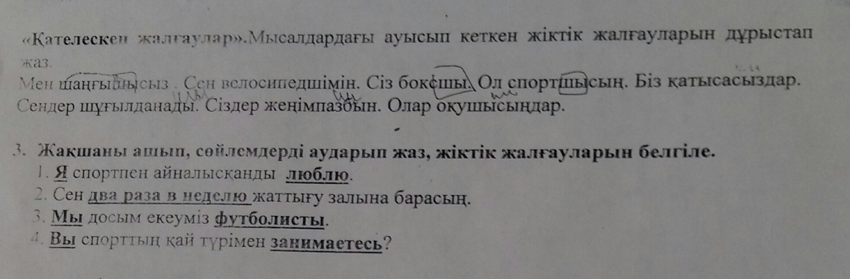 3. Мен спортпен айнадысқанды унатамын. Сен аптасына екі рет жаттығу залына барасың. Біз досым екеуміз футболшымыз. Сендер спорттын қай турімен айналысасындар?