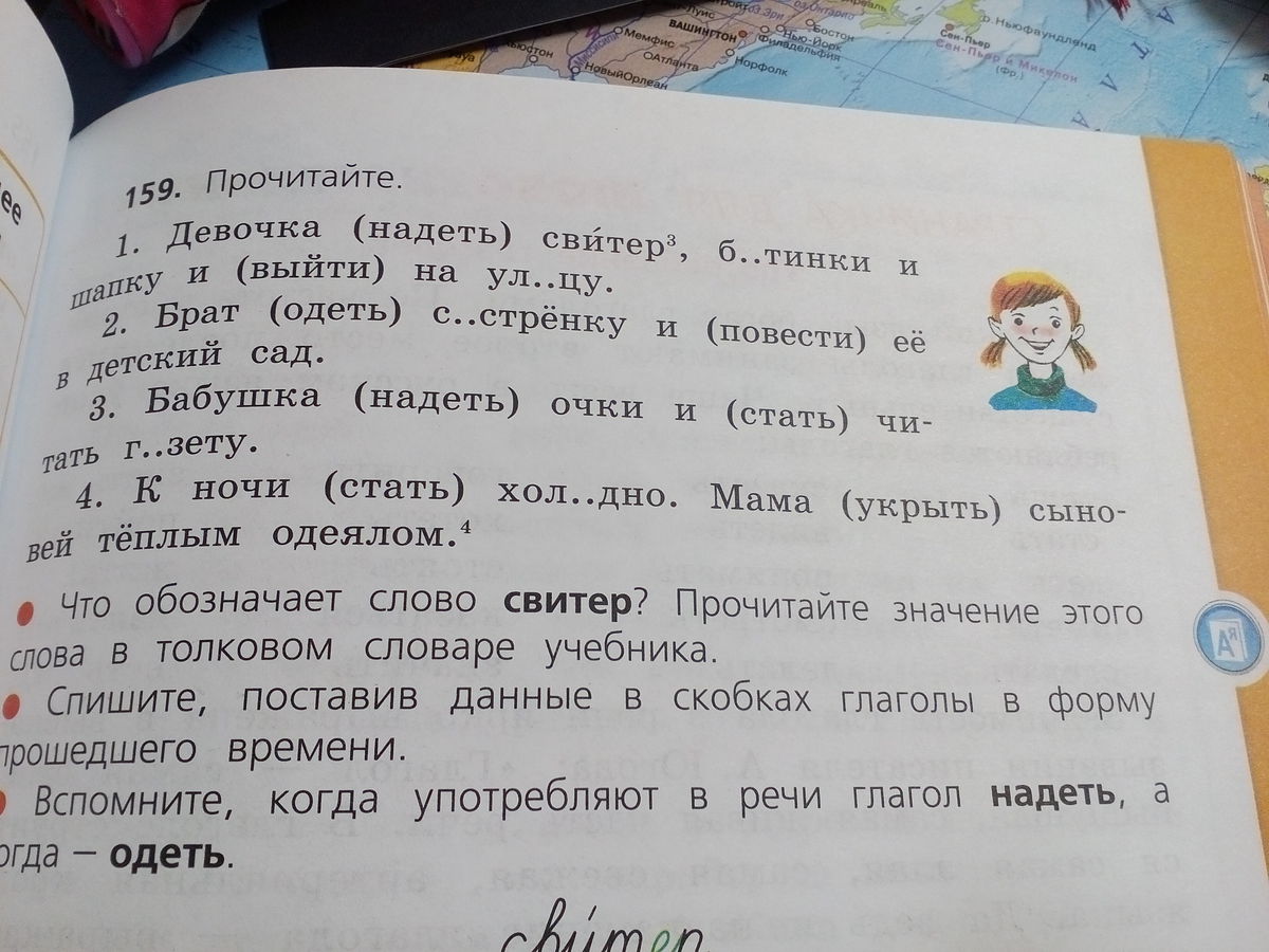 1.Девочка надела свитер,ботинки и шапку и вышла на улицу.