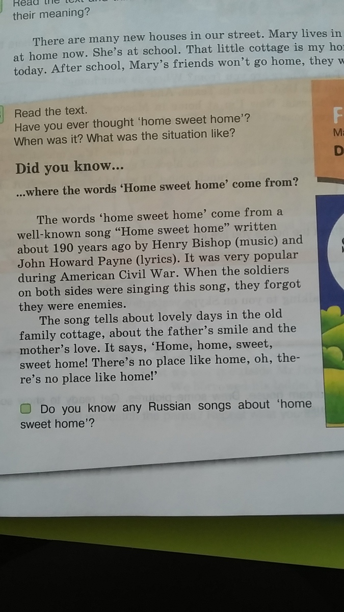 Песня рассказывала о прекрасных днях в старом семейном коттедже, об улыбке отца и любви матери. В ней поется " Дом, дом, милый, милый дом! Нет нигде лучше места как дом , оу, не нигде лучше места как дом!"