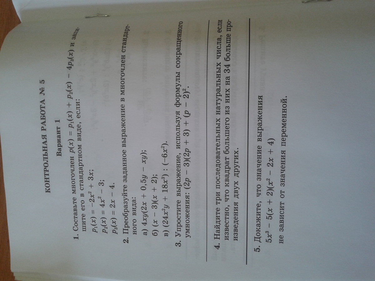 5. =5х³-5(х³+8)=5х³-5х³-40=-40(подобные слагаемые взаимно уничтожились,поэтому значение выражения не зависит от переменной). 3.=4р²-9+р²-4р+4=3р²-4р-5. 4. пусть х-1число,тогда 2- (х+1); третье (х+2).Составим ур-е: (х+2)²-х(х+1)=34; х²+4х+4-х²-х=34; 3х=30;х=10-1число; 2число 10+1=11; 3число 10+2=12. ответ: 10;11;12