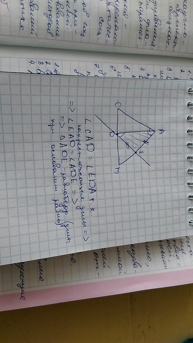 Отрезок AD - биссектриса треугольника ABC. Через точку D проведена прямая, параллельная AC и пересекающая сторону AB в точке E. Докажите, что треугольник ADE - равнобедренный. Прошу помочь выходит двойка по геометрии.