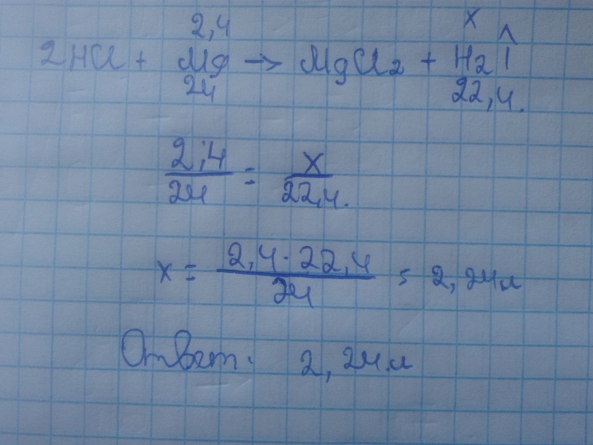 Рассчитайте обьем водорода, полученный в результате реакции солянной кислоты с магнием массой 2,4 г