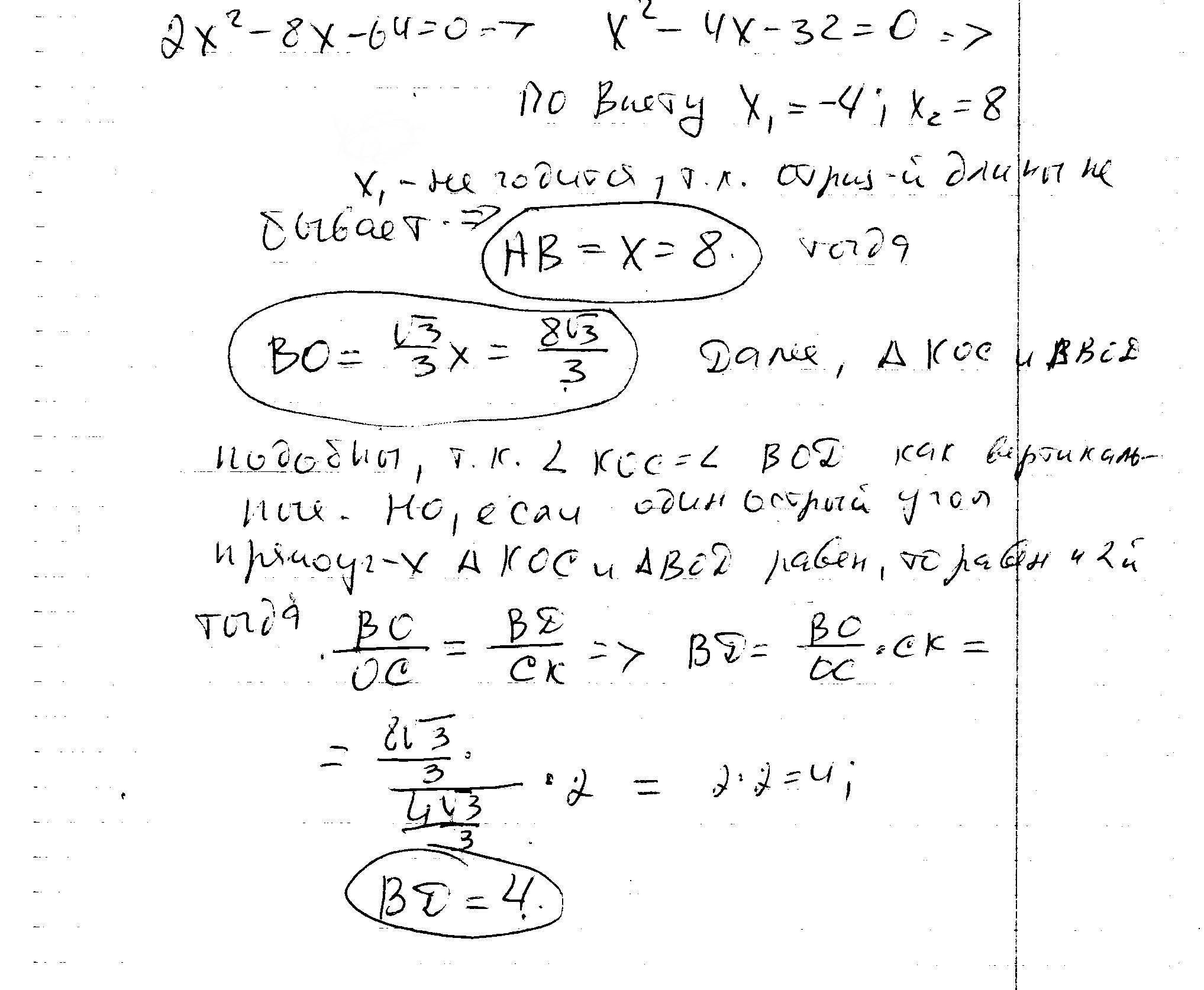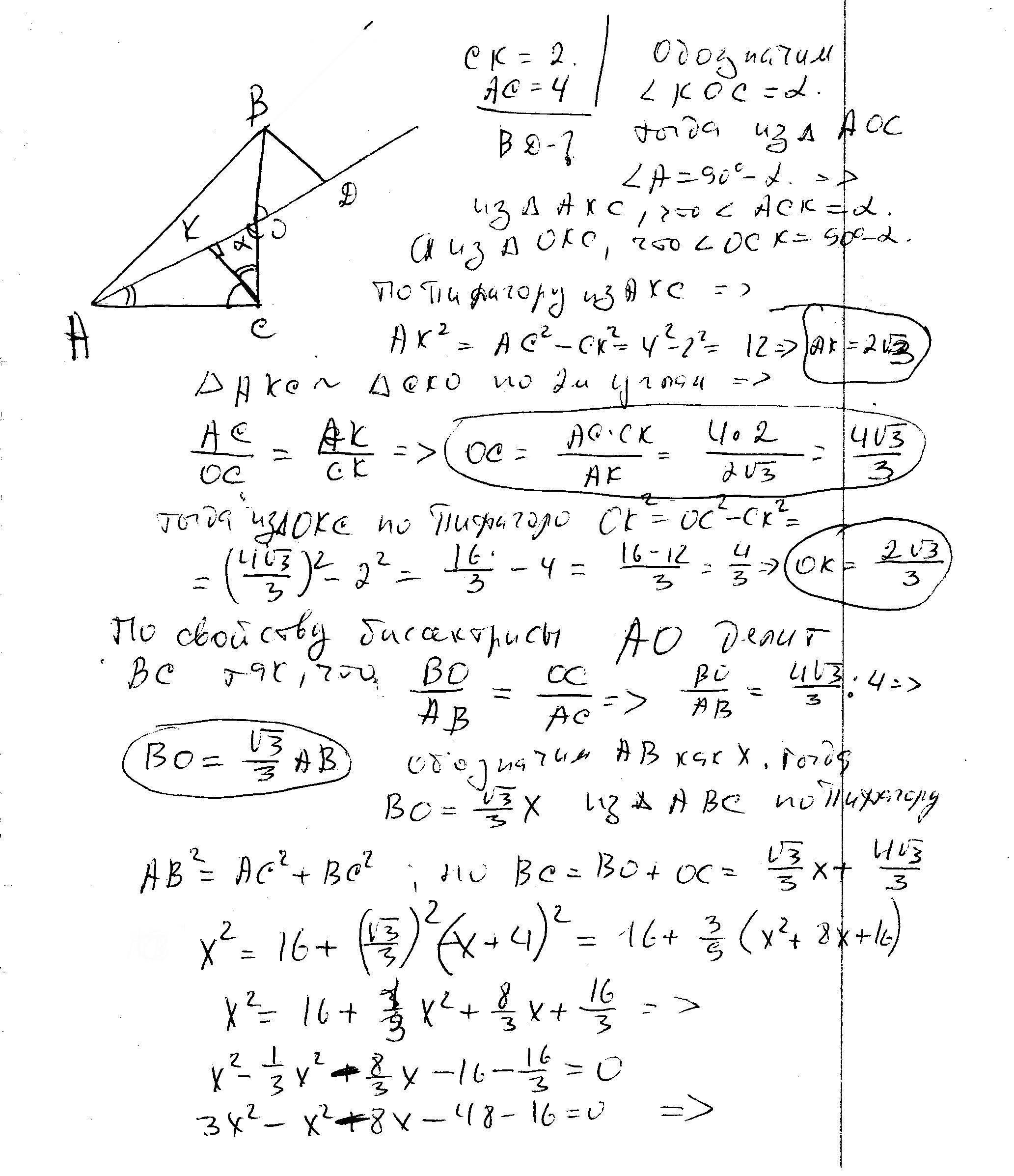 В треугольнике ABC угол C - прямой, АС = 4. Чему равно расстояние от вершины В до биссектрисы угла А если расстояние от вершины С до этой биссектрисы равно 2