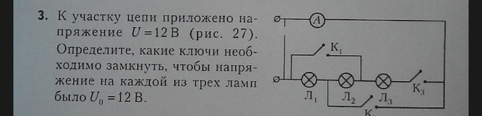 К участку цепи приложено напряжение U=12 В. Определите какие ключи необходимо замкнуть чтобы напряжение на каждой из трех ламп было Uо= 12В. Помогите решить задачу, пожалуйста!