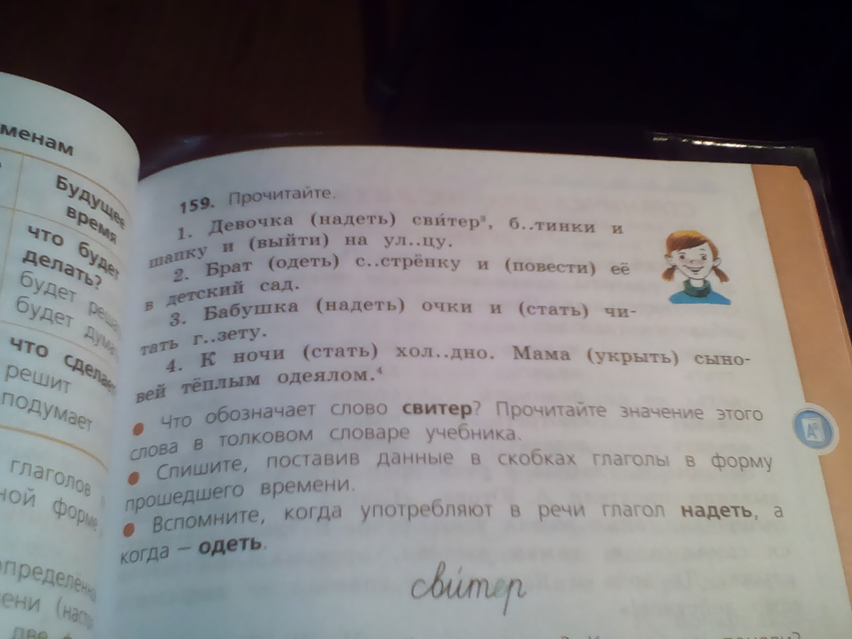 1.Девочка надевала свитер,ботинки и шапку и выходила на улицу.