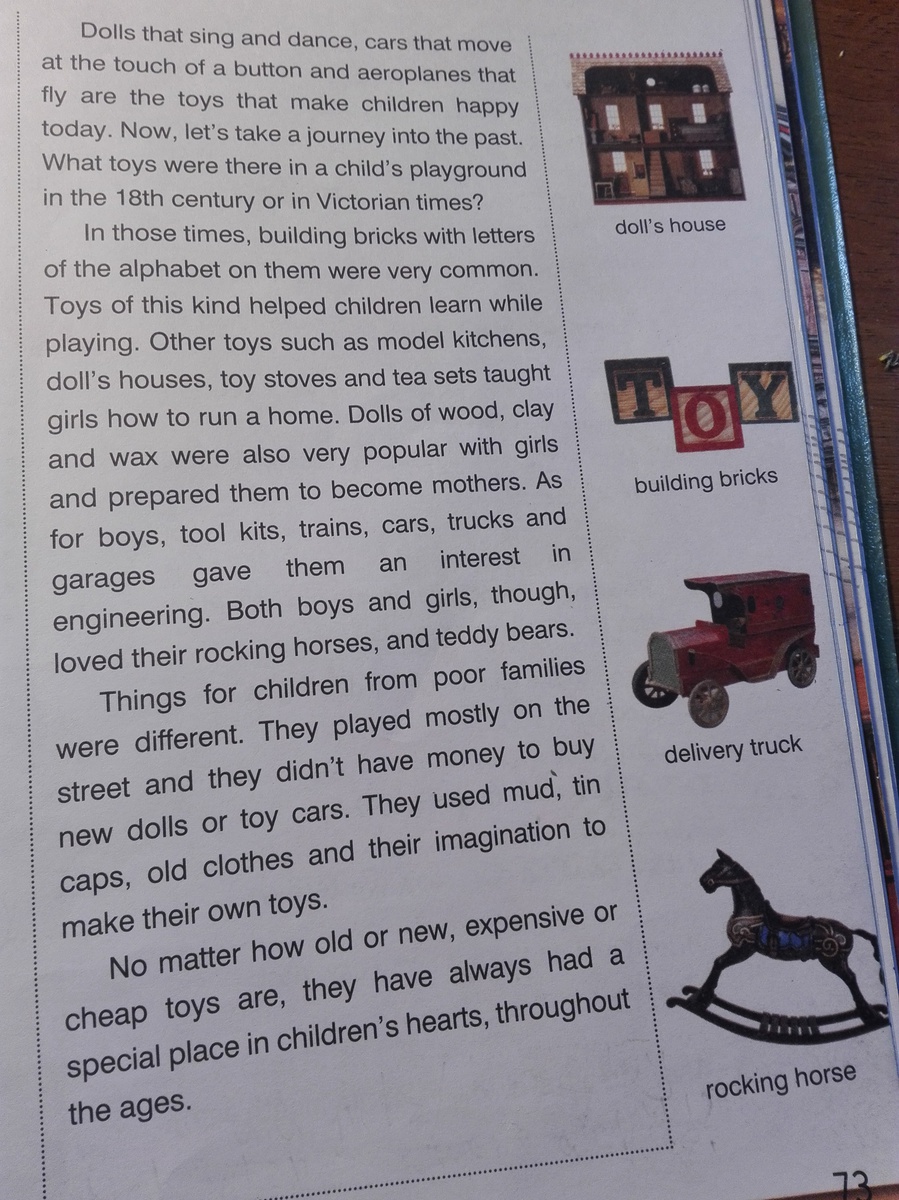 Куклы, которые поют и танцуют, автомобили, которые движутся по нажатию на кнопку, и самолетов, которые летают являются игрушки, которые делают детей счастливыми сегодня. Теперь, давайте совершим путешествие в прошлое. Какие игрушки были там в детскую игровую площадку в 18 веке или викторианские времена? В те времена, строительных блоков с буквами алфавита на них были очень распространены. Игрушки такого рода помогают детям учиться, играя. Другие игрушки, такие как модель кухни, дома куклы, игрушки печи и чайные сервизы учить девочек, как управлять домом. Куклы из дерева, глины и воска были также очень популярны среди девочек и подготовили их, чтобы стать матерями. Как для мальчиков, наборы инструментов, поезда, автомобили, грузовики и гаражи дал им интерес к технике. И мальчики, и девочки, хотя, любили своих качалки, и плюшевых медведей. Вещи для детей из малообеспеченных семей были разные. Они играли в основном на улице, и у них не было денег, чтобы купить новые куклы или машинки. Они использовали грязь, олово шапки, старую одежду и свое воображение, чтобы сделать свои собственные игрушки. Независимо от того, старые или новые, дорогие или дешевые игрушки, они всегда занимают особое место в сердцах детей, на протяжении веков.