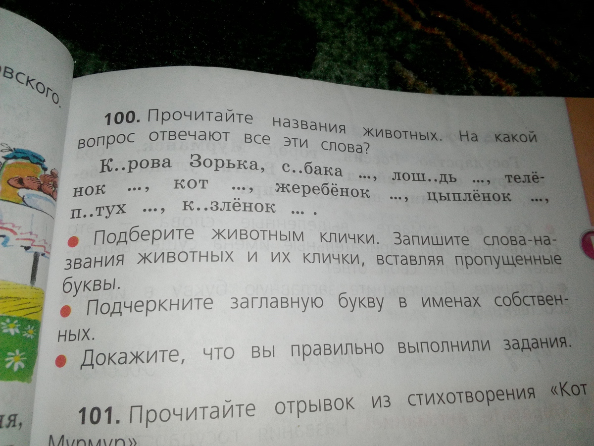 100. Корова Зорька, собака Шарик, лошадь Антонина, телёнок Боря, кот Мурзик, жеребёнок Толя, цыплёнок Петя, петух Вася, козлёнок Тимка.