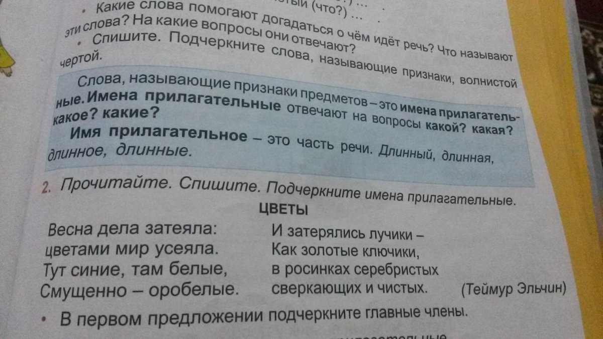 упражнение номер 2 Подчеркните имена прилагательные.В первом предложение Подчеркните главные члены помогите пожалуйста за ранее спасибо