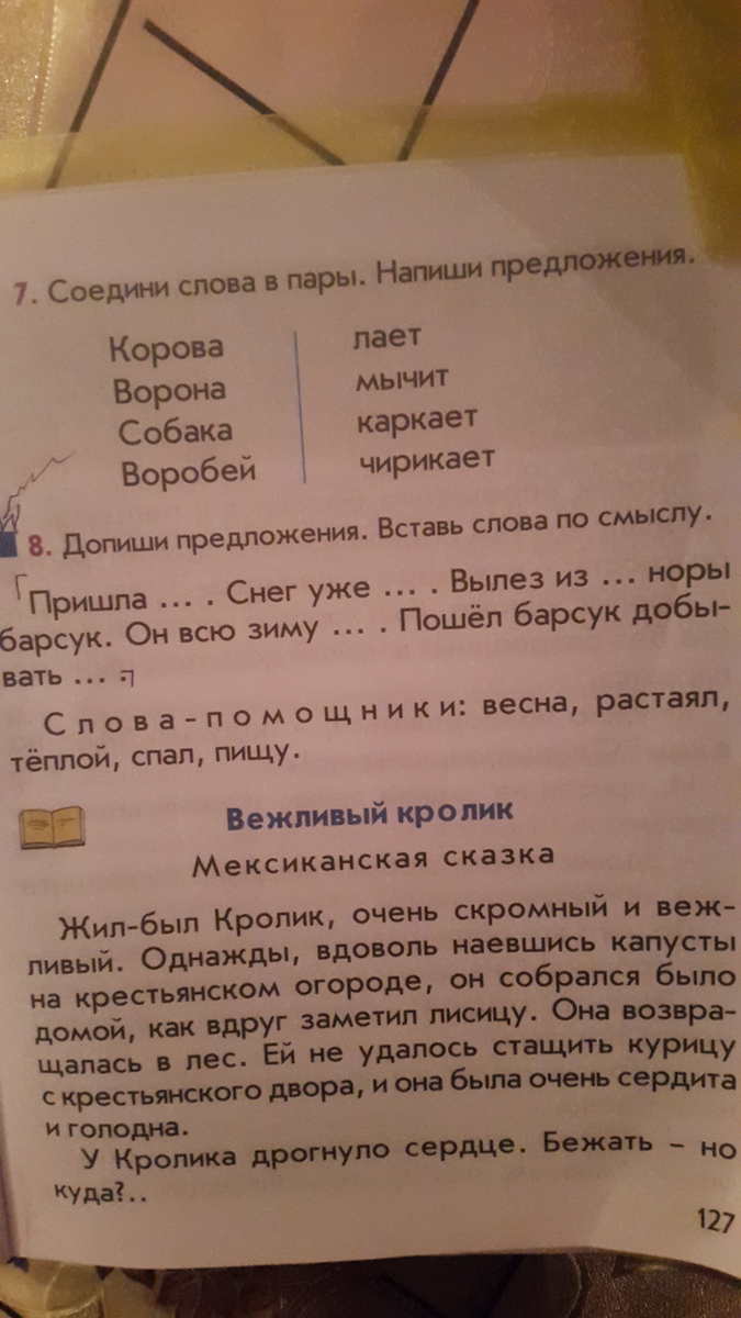 Пришла весна. Снег уже растаял. Вылез из теплой норы барсук. Он всю зиму спал. Пошел барсук добывать пищу..