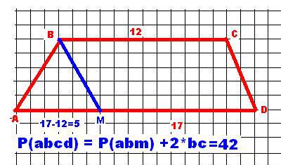 в трапеции abcd с основаниями ad=17 и bc =12 провели отрезок bm параллельно стороне cd чему равен периметр этой трапеции если известно что периметр треугольника abm= 18 см.