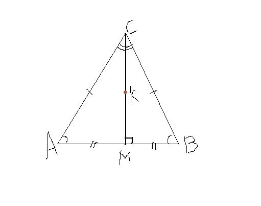 Внутри равнобедренного треугольника АВС с основанием АВ взята точка М так,что АМ=МВ.Докажите,что луч СМ-биссектриса угла АСВ.Опустите перпендикуляр МК на АВ.Лежат ли точки С,М,и К на одной прямой.Ответ поясните