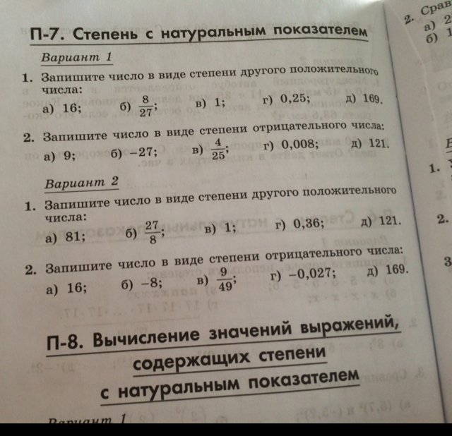 1 вариант:1 а)4 в квадрате б)2/3 -это дробь в кубе в)2 в нулевой степени г)0,5 в квадрате д)13 в квадрате. 2 а)-3 в квадрате б)-3 в кубе в)-2/5-это дробь в квадрате г)0,2 в квадрате д)-11 в квадрате 2 вариант: 1 а) 9 в квадрате б)3/2 это дробь в кубе в)0,6 в квадрате г)11 в квадрате 2 а)-4 в квадрате б)-2 в кубе в)-3/7 это дробь в квадрате г)-0,3 в кубе д)-133 в квадрате.