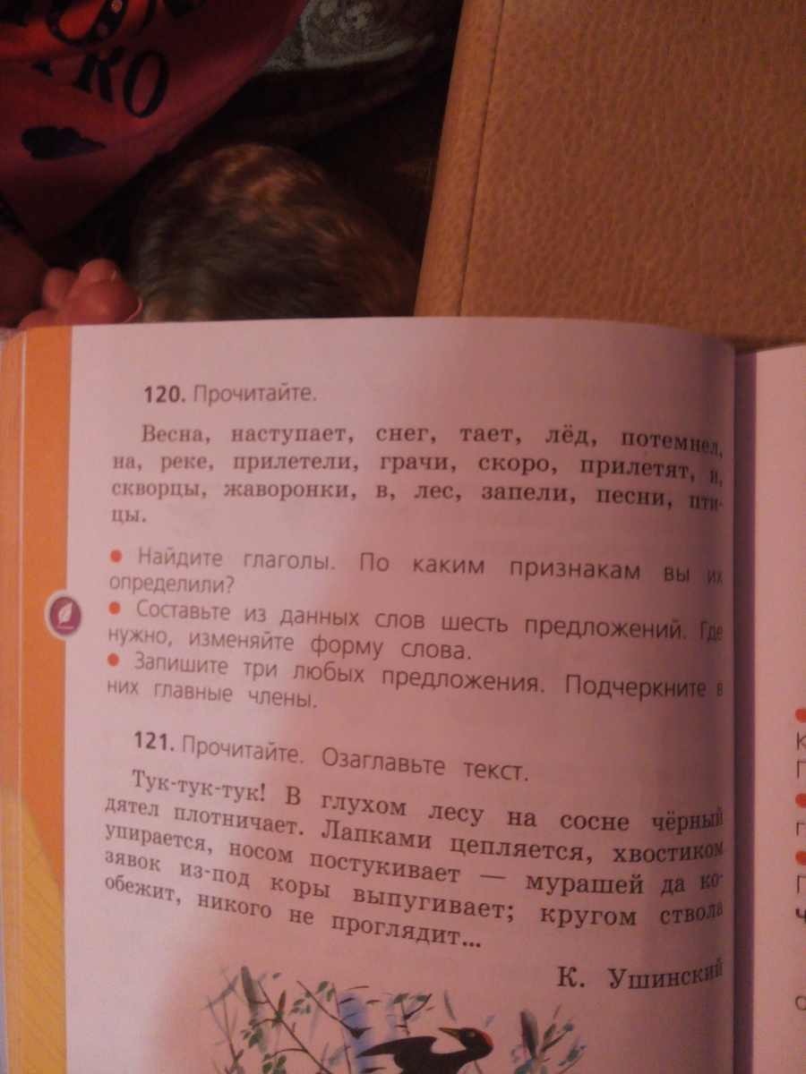 Весна наступает .( весна-подлеж., наступает сказ.) Тает снег. ( тает- сказ., снег- подлеж.) На реке потемнел лед. ( потемнел- сказ., лед- подлеж.) Прилетели грачи. ( прилетели- сказ. грачи- подлеж.)Скоро прилетят скворцы и жаворонки. ( прилетят- сказ., скворцы и жаворонки- подлеж.)В лесу запели песни птицы.( запели- сказ., птицы подлеж.)
