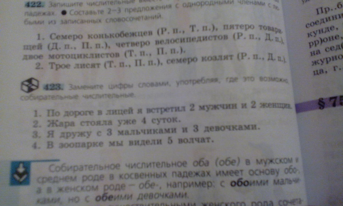 по дороге в лицей я встретил двух мужчин и двух женщин.жара стояла уже четыре суток.я дружу с тремя мальчиками и тремя девочками .в зоопарке мы видели пять волчат