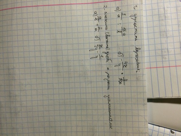 1. a) 8/a : 16a/b = 8/a * b/16a = b/2a^2; б) - 4х/у * у/2х = - 2. 2. a) a/b + 2/a = a^2/ab + 2b/ab = a^2 + 2b/ ab; б) х/8у - 1/у = х/8у - 8/8у = х - 8/8у