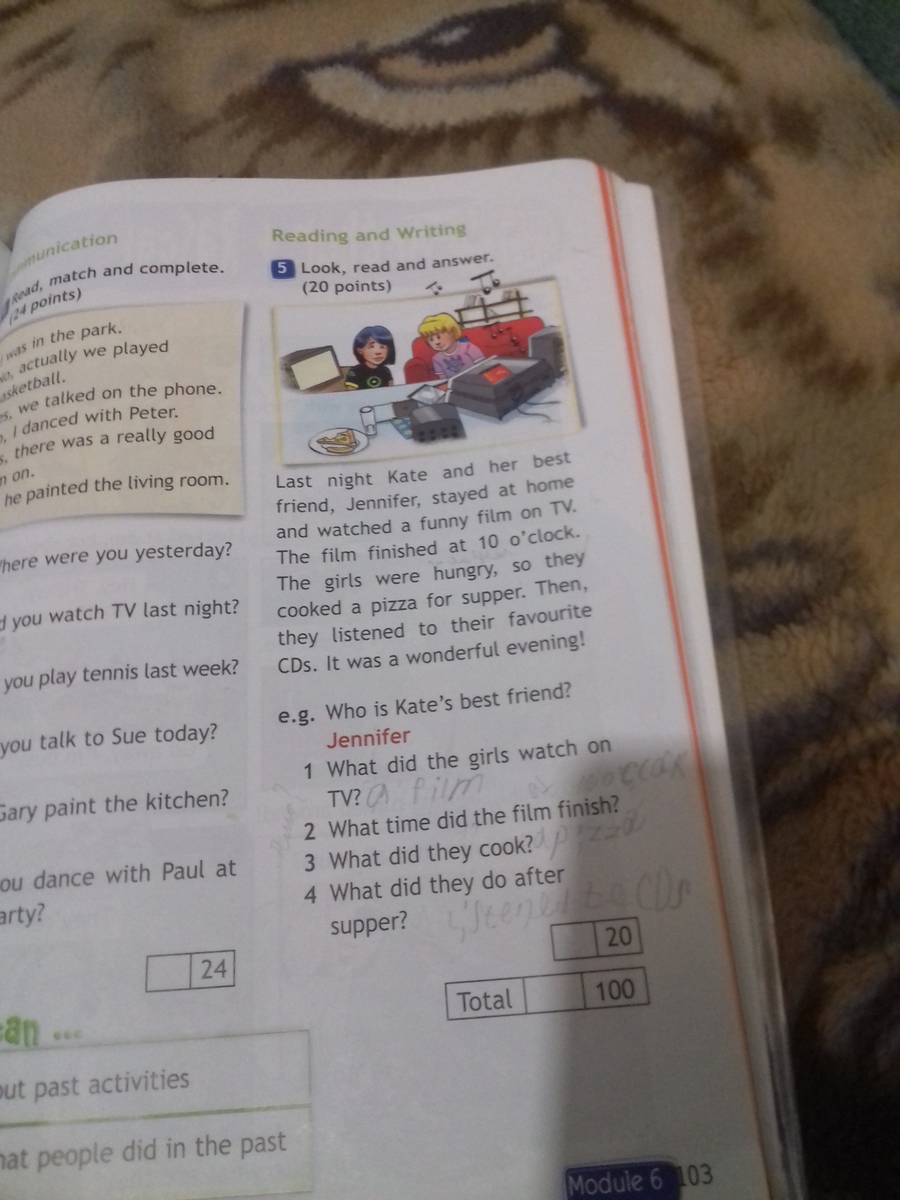 Каждой ночью Кейт и ее лучшая подруга,Дженефер,остаются дома и смотрят веселые фильм по телевизору, фильм заканчивается в 10 часов. Деввочки хотят есть , они готовят пиццу на ужин. Они слушают любимые диски Это лучший вечер!