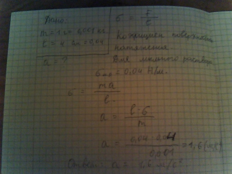 Соломинка длиной 4 см плавает на поверхности воды. С одной стороны от нее капают мыльный раствор. С каким ускорением начнёт двигаться соломинка, если ее масса равна 1г?