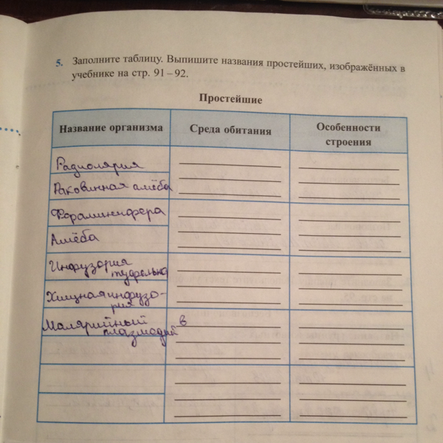 Заполните таблицу. Выпишите названия простейших, изображённых в учебнике на стр. 91-92.