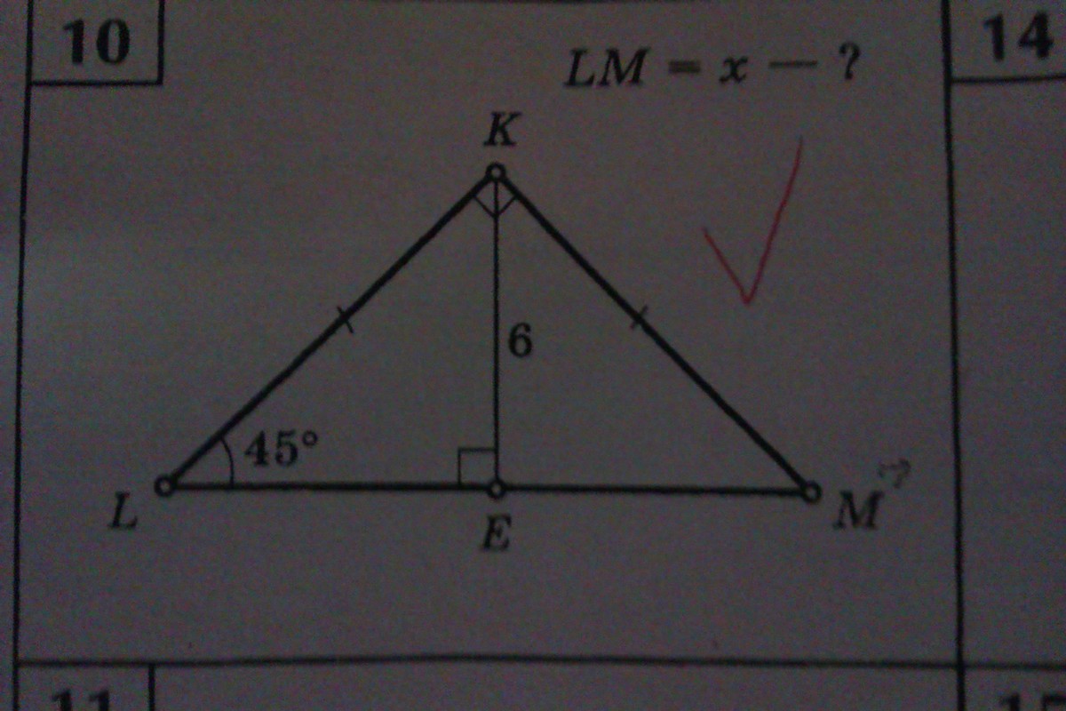 Треугольник LKM равнобедренный, KE = 6 угол, L= 45 градусам, угол LEK= 90 градусам, угол LKM= 90 градусам. Найти сторону LM