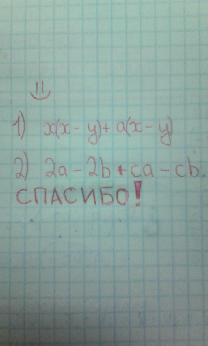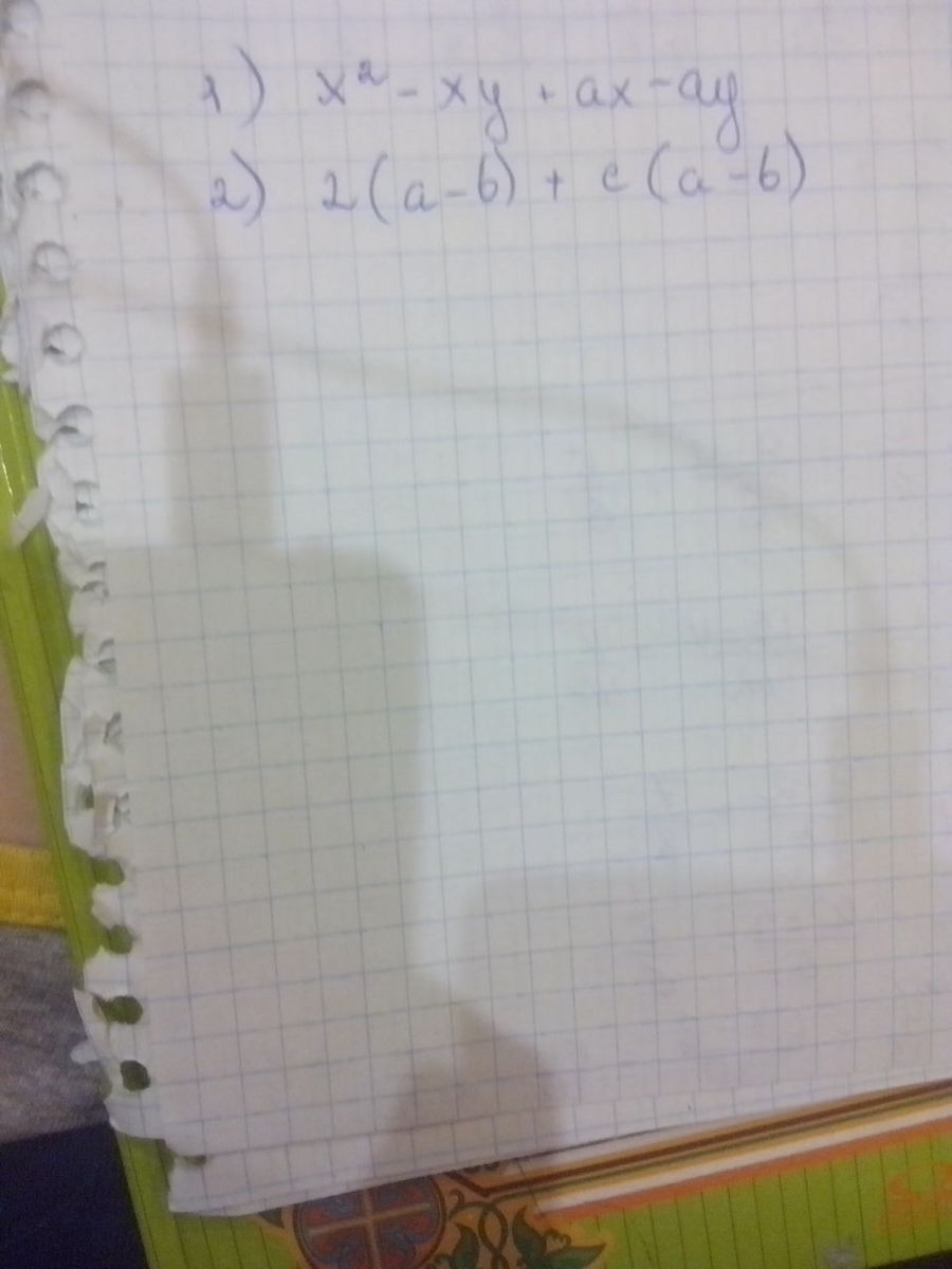 1)=(х-у)(х+а); 2)=а(2+с)-b(2+c)=(2+с)(а-b)