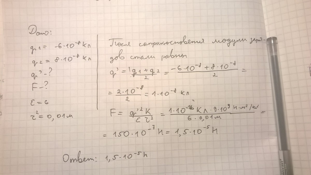 ЗАДАЧА. Два одинаковых металлических шарика с зарядами q1("ку"один)=-6*10^-8 ,q2=8*10^-8.Привели с соприкосновение и раздвинули на 10см. Определить ,силу взаимодействия зарядов в диэлектрике с проницаемостью 6.