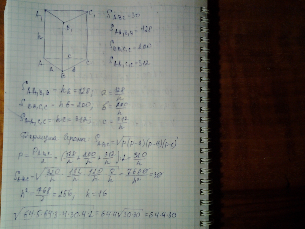 Площадь основания и площади боковых граней прямой треугольной призмы соответственно равны 30 см^2, 128 см ^2, 200 см^2 и 312 см^2. Найдите высоту призмы.