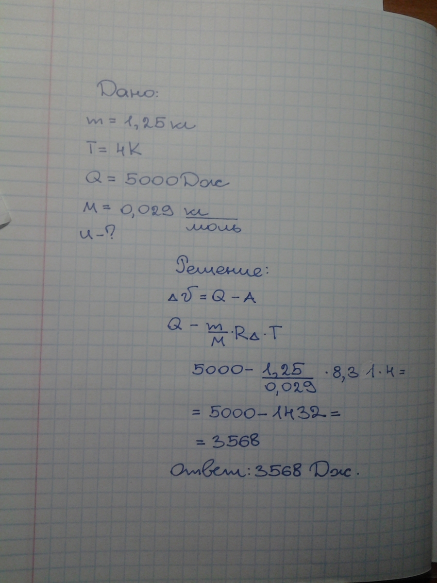 В цилиндре под поршнем находится 1,25 кг воздуха. Для его нагревания на 4 градуса Цельсия при постоянном давлении было затрачено 5 кДж теплоты. Определите изменение внутренней энергии воздуха(М=0,029кг/моль).