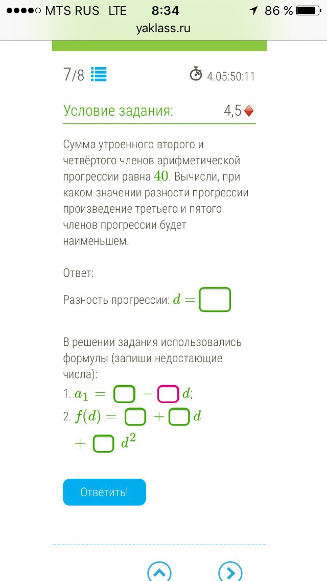 Сумма утроенного второго и четвёртого членов арифметической прогрессии равна 40. Вычисли, при каком значении разности прогрессии произведение третьего и пятого членов прогрессии будет наименьшем.