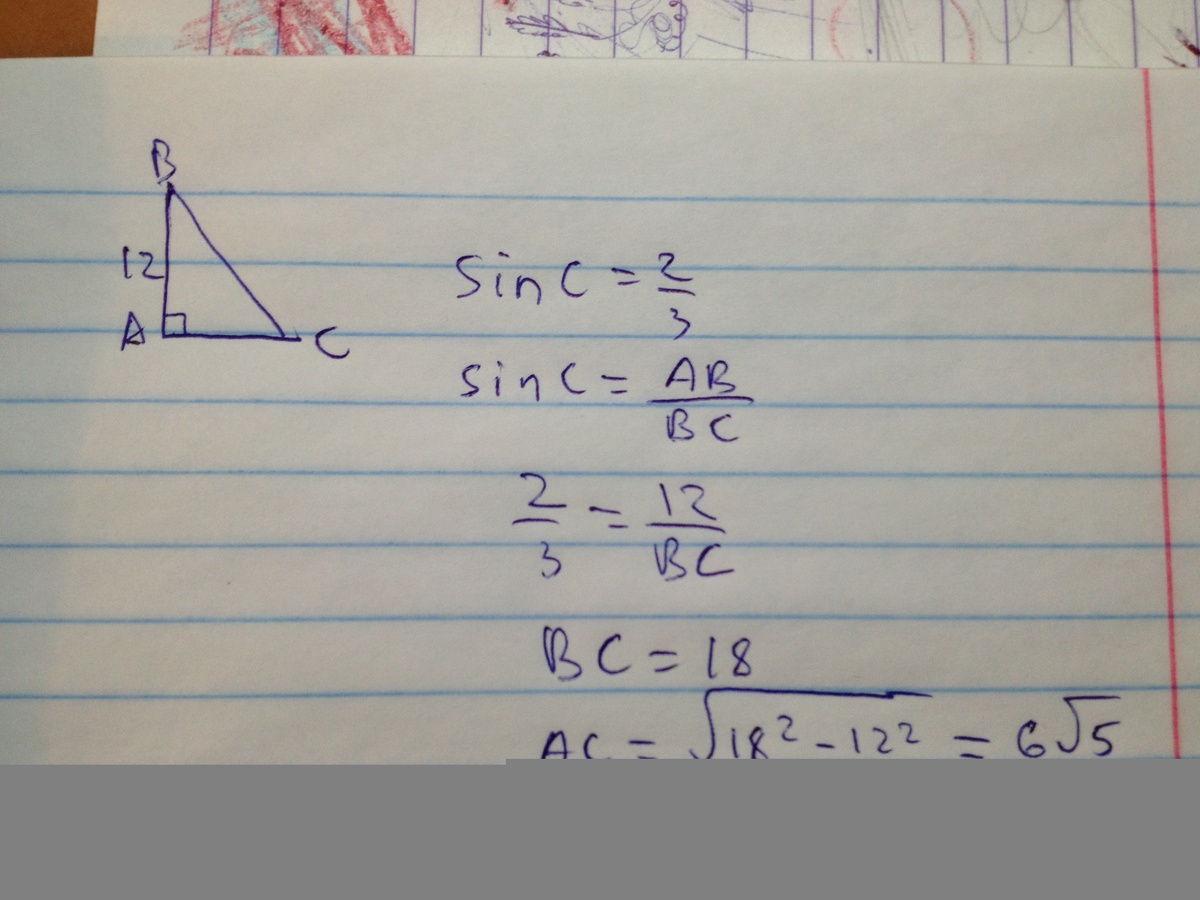 В прямоугольном треугольнике ABC угол А=90 градусов. AB=12СМ, sinC= две тритьих (дробь) . Найдите CB и AC