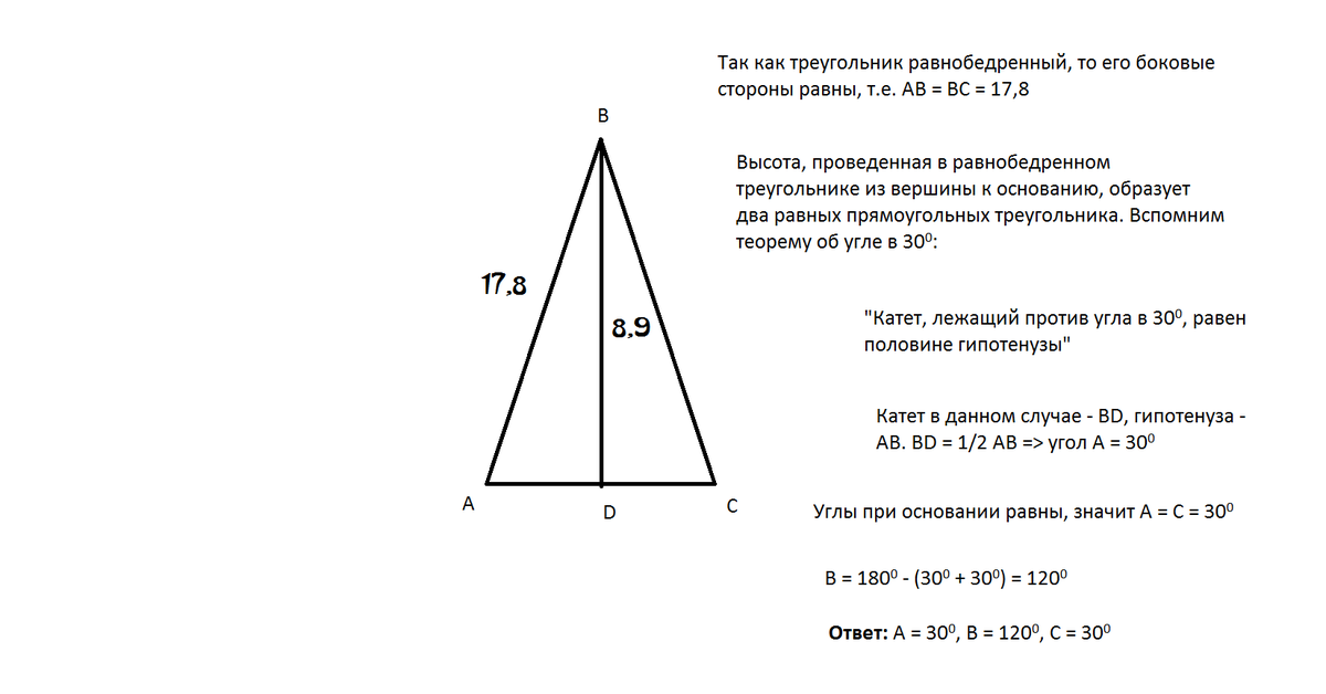 Высота проведённая к основанию равнобедренного треугольника равна 8.9 см а боковая сторона треугольника равна 17.8 см найдите Углы этого треугольника