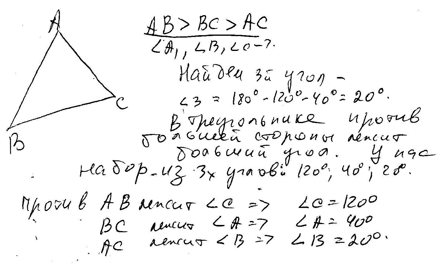 В треугольнике АВС АВ больше ВС больше АС. Найдите углы А, В, С если известно что один из углов треугольника равен 120 градусов, а другой 40