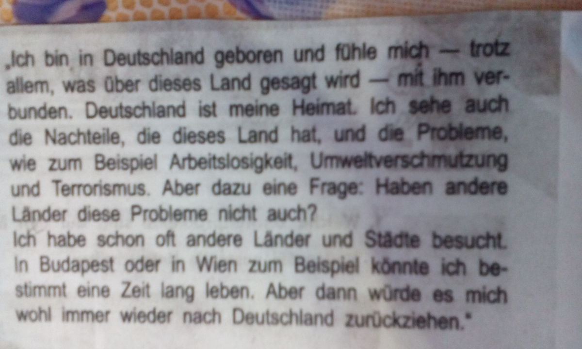 Я родился в Германии и чувствую себя -- несмотря на всё,что говорят об этой стране -- связанным с ней. Германия -- моя Родина. Я также вижу недостатки,которые есть в этой стране,и проблемы,как,например,безработица,загрязнение окружающей среды и терроризм. Возникает вопрос: Разве у других стран нет этих же проблем?