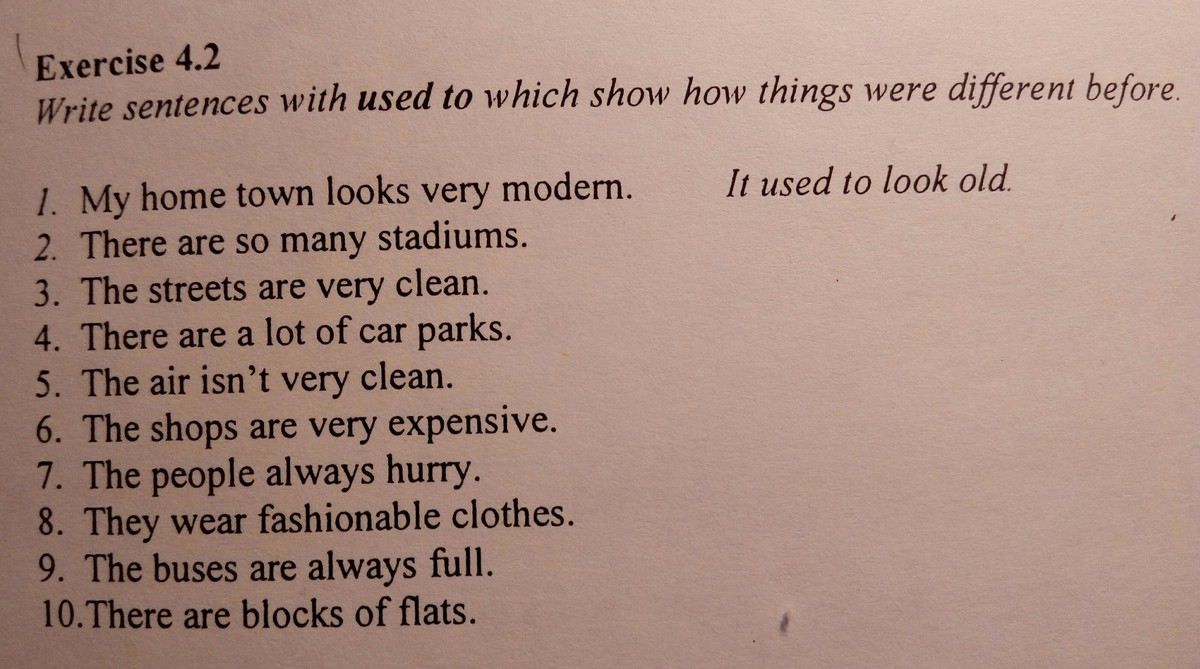 2. There used to be only one stadium; 3. The streets used to be dirty; 4. There used to be just one car park; 5. It used to be fresh; 6. The prices used to be low; 7. They used to be more laid-back (спокойные); 8. They used to wear cheap clothes; 9. The buses used to be empty; 10. There used to be an empty space here.