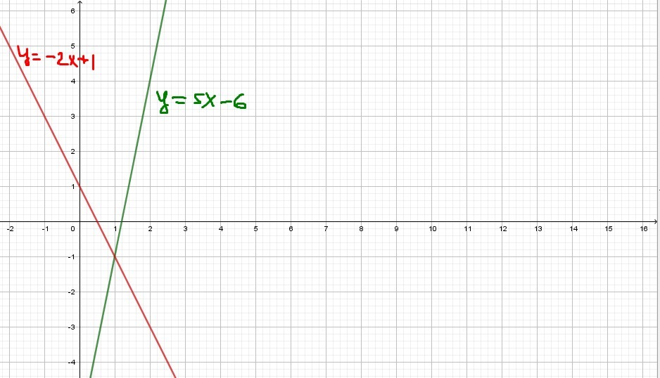Постройте в одной системе координат графики функций y=5x-6 и y=-2 x+1 и найдите координаты точки их пересечения.ПОМОГИТЕ ПОЖАЛУЙСТА
