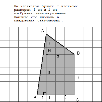 Обозначим 4угольник буквами ABCD, проведем высоты AL к BC и DH к AL, тогда площадь 4угольник = площади треугольников ALB и AHD и прямоугольника LHDC. Площади прямоугольных треугольников находятся, как 1/2 произведения катетов, а площадь прямоугольника, как произведение смежных сторон.