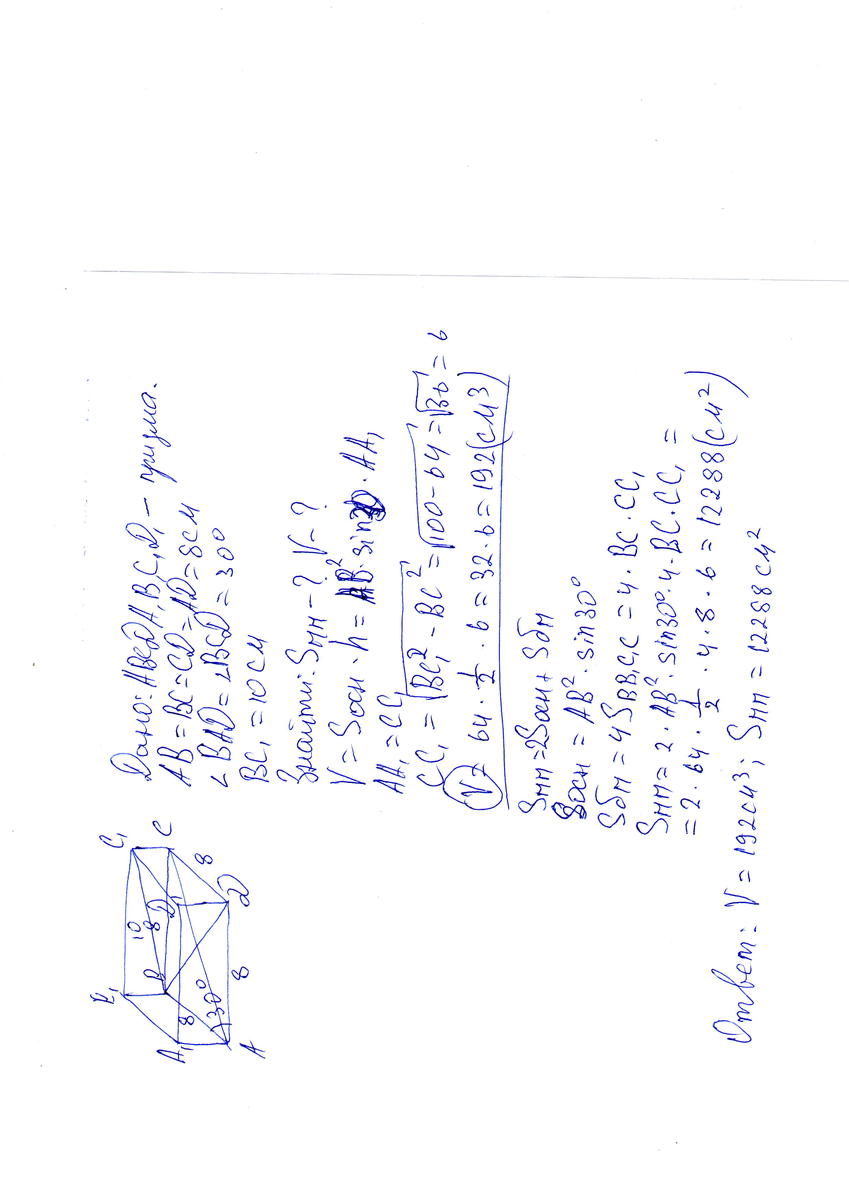 В основании прямой призмы ромб со стороной 8см и углом 30 градусов, диагональ боковой грани 10см. Найти площадь полной поверхности и объем призмы