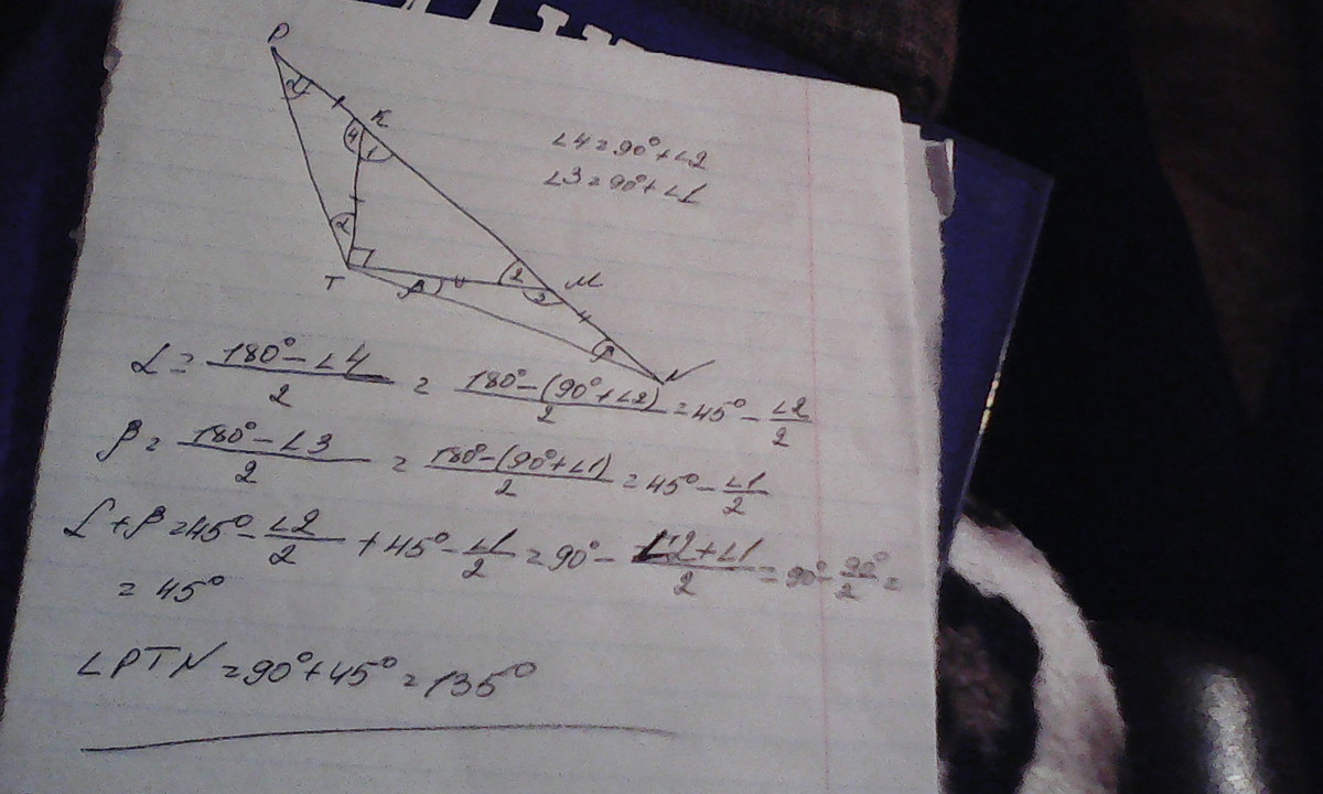 КТМ-прямоугольный треугольник с прямым углом Т. Отрезки КР и MN отложены на прямой КМ по обе стороны гипотенузы, причём КР=КТ и МN=МТ. Чему равен угол PTN