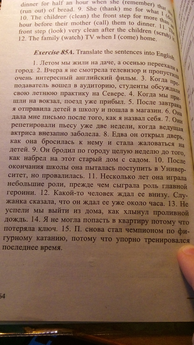 1.this summer we had been living in the summer house,and in autumn moved to the city.2.Yesterday I didn't watch tv and skip very interesting English film.3.When teacher came in class,students were talking about their summer practice in North.4.When we came to the railway station,the train had already arrived.5.After breakfast i sent children to the school and went to the shop.6.She gave me a letter after I called myself.7.they have been rehearsing play for two weeks when leading actress sickened suddenly.8.He barely opened the door as she rushed to him and started to complain about kids.9.He was wandering in the city during whole week until he came across this old house with garden.10. After finishing school she tried to go into university,but she failed.11.some years she had been playing small roles before she played the leading role.12.Someone was waiting for here below.Maid said that he has beenwaiting for her for hour.14.I couldn't get in to the flat because I have lost my key.13.We have just gone out of the flat,it started shower.15 P became a ice skating champion again because she was training hard so far